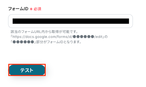 入力が完了したら「テスト」をクリックし、Googleフォームに送信した回答内容が正しく取得できるか確認しましょう。