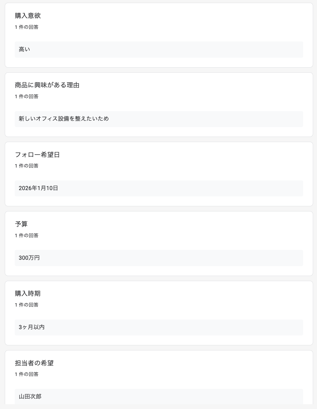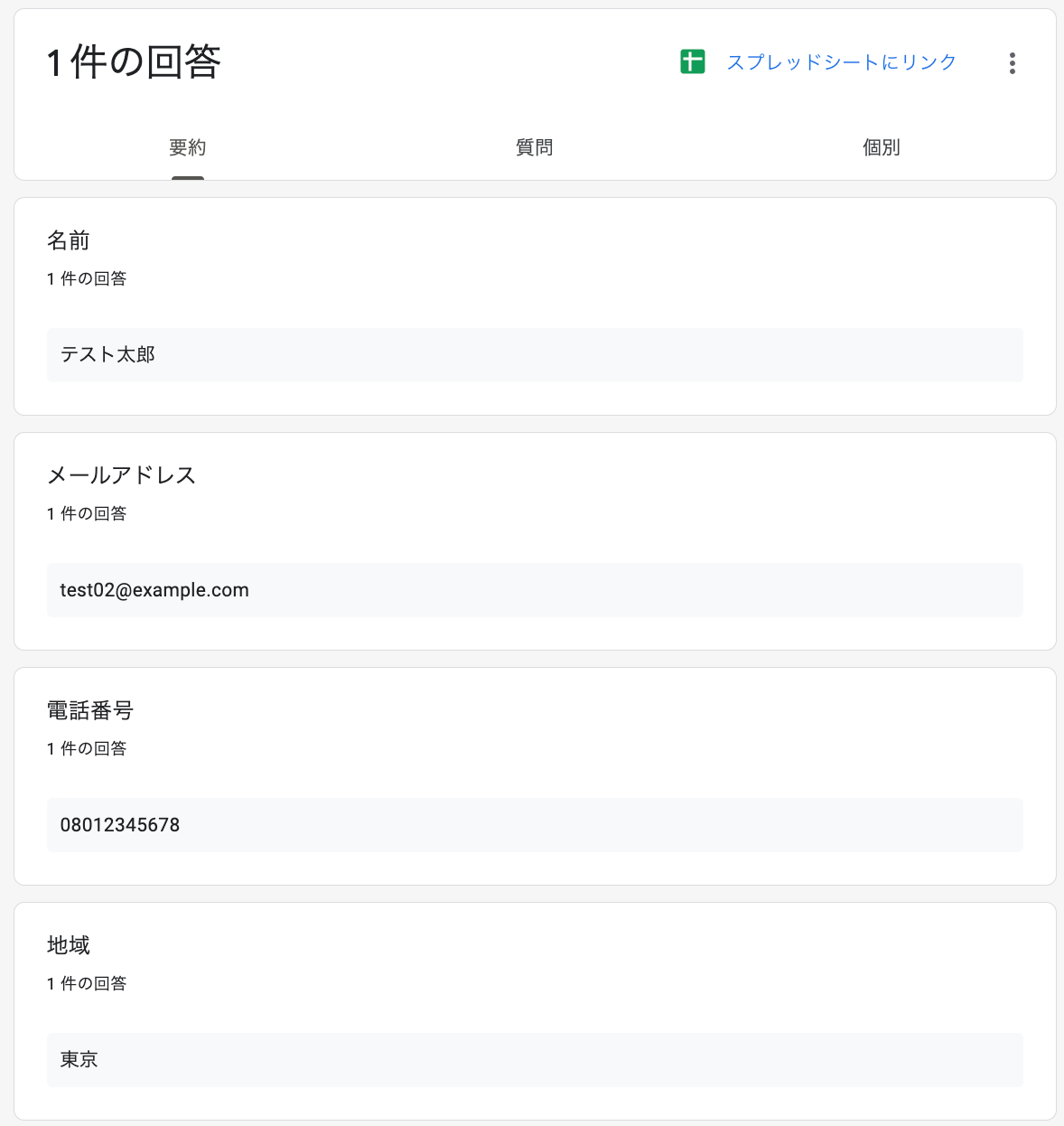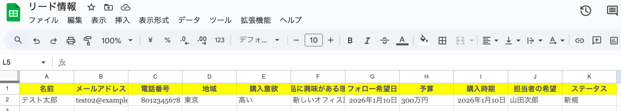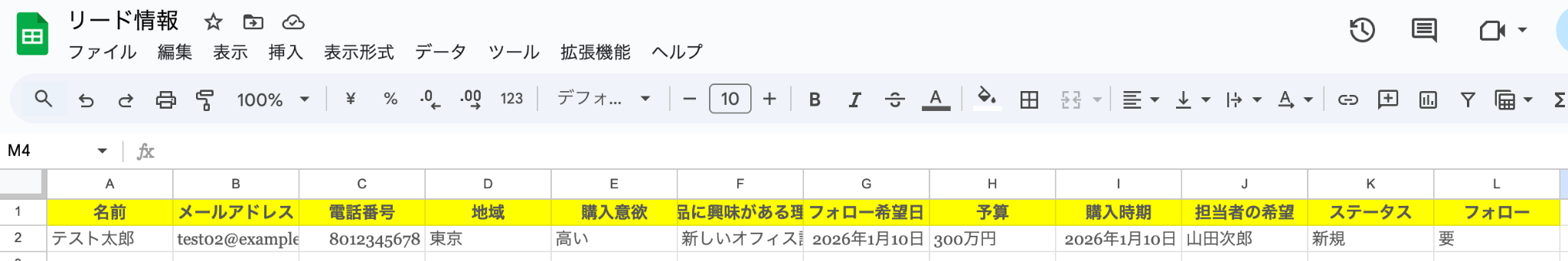 事前準備として、あらかじめGoogleフォームでテスト用に回答(リード情報)を送信しておきましょう。