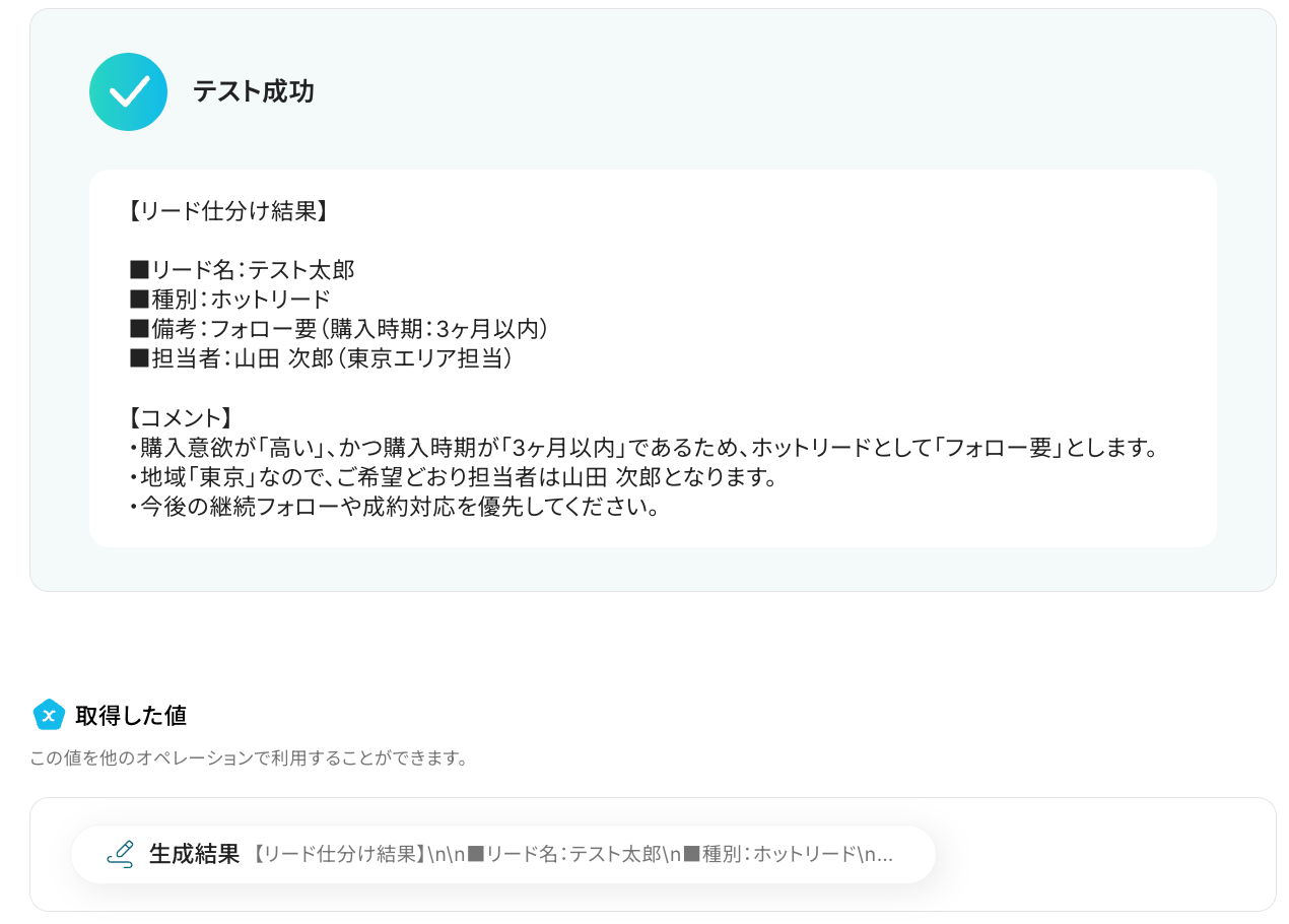 入力が完了したら「テスト」をクリックして、設定した内容でテキストが正しく生成されるか確認しましょう。