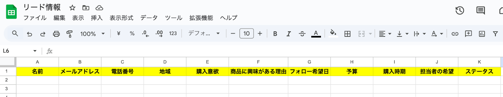 事前準備として、Google スプレッドシートでデータを追加するためのデータベースをあらかじめ作成しておきましょう。 今回はテスト用に、以下の内容で作成しました。