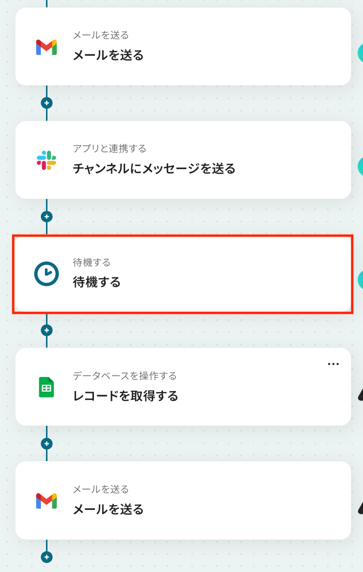 フローボット内でGmailのメール送信アクションの前に「待機する」オペレーションを追加することで、次のオペレーションを実行するまでの待機時間を設定できます。