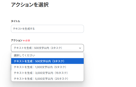 アクションを選択する画面が表示されます。 テンプレートでは「500文字以内(3タスク)」が設定されていますが、任意の文字数で設定することが可能です。 設定後「次へ」をクリックしましょう。