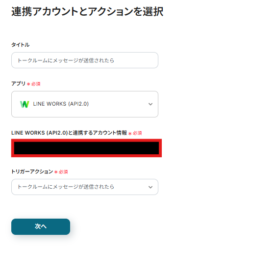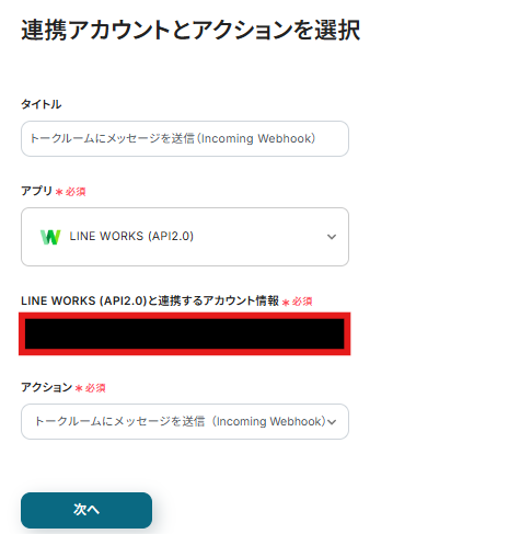 連携アカウントとアクションを選択する画面が表示されるので、今回連携するLINE WORKSのアカウントを確認し「次へ」をクリックします。
