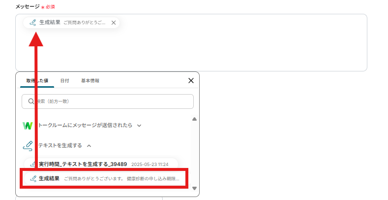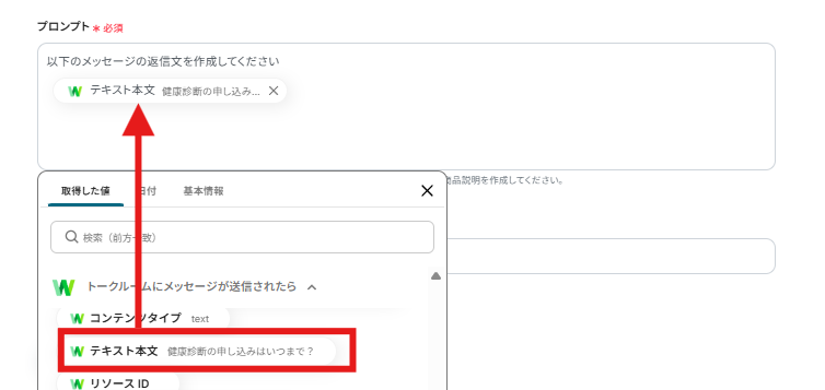 つぎに、プロンプトの設定(AIへの指示)を入力しましょう。 以下のように取得した値を選択すると、メッセージ内容を簡単に入力することができます。