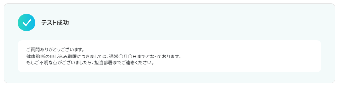 入力後「テスト」をクリックし、実際に回答が生成されているか確認しましょう。 以下のように回答が生成されていることを確認し「保存する」をクリックしましょう。