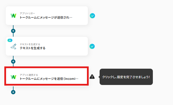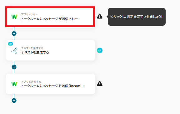 トークルームにメッセージが投稿されたことを、この自動化のトリガー(起点)にするための設定を行いましょう。 以下の赤枠をクリックします。