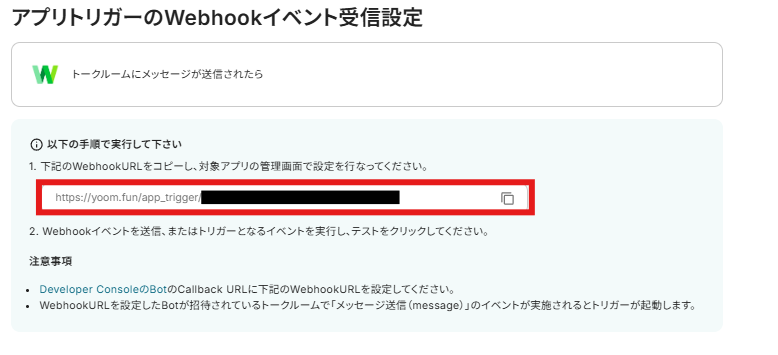 Webhookの設定画面があるため、LINE WORKSで設定を行いましょう。