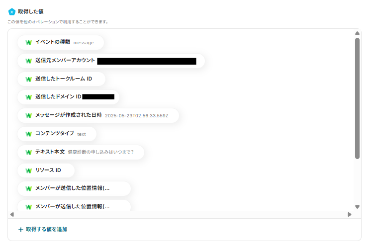 送信後「テスト」をクリックし、以下のように送信された内容が確認出来たら「保存する」をクリックしましょう。 この後、この取得した値の内容を入力に使用することができます。 ※取得した値に関して、詳しくはこちら をご確認ください。