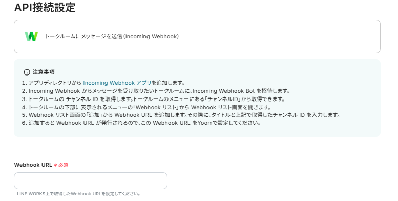 WebhookURLには、説明に従ってLINE WORKSで取得したWebhookURLを入力しましょう。
