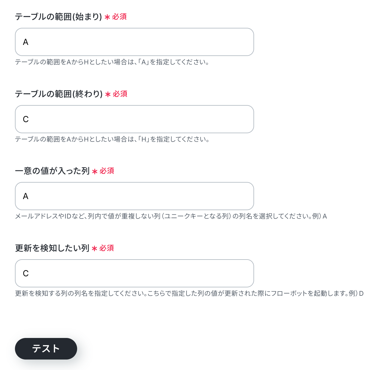 レコードを特定するためのユニークな列を選びます。 重複しない値が入る列を指定しましょう。更新を検知したい列 Google スプレッドシートのどの列の変更を検知するかを指定します。 今回は、事前準備で用意した「更新」列を指定し、この列に「◯」が入力された際にフローが起動するように設定しました。 入力が完了したら、設定内容とトリガーの動作を確認するため「テスト」をクリックします。 テストがうまくいかない場合などは、以下のヘルプページも参考にしてみてください。