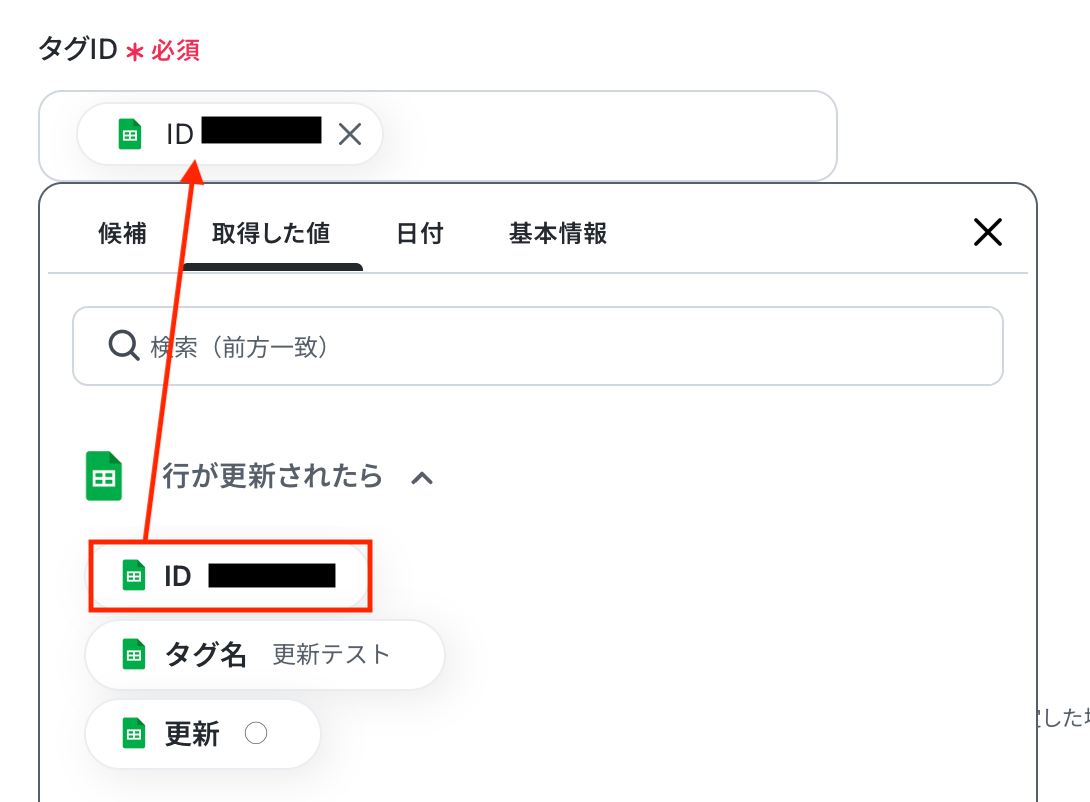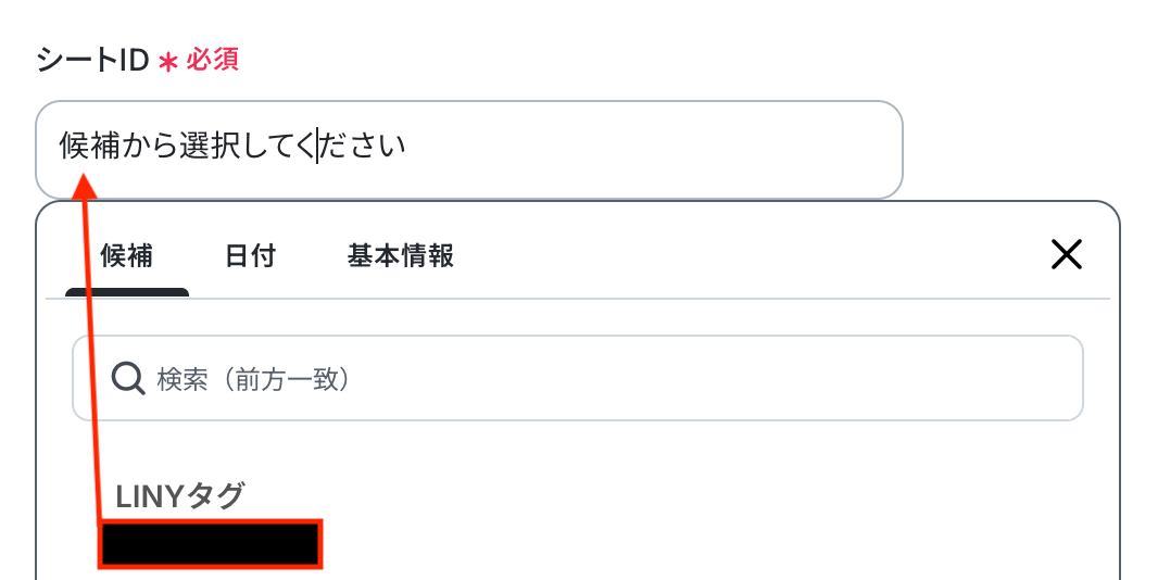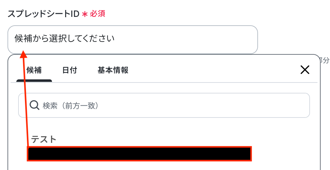 入力欄をクリックすると、同じく連携が有効になっているスプレッドシートから候補が表示されるので、対象の項目を選択してください。