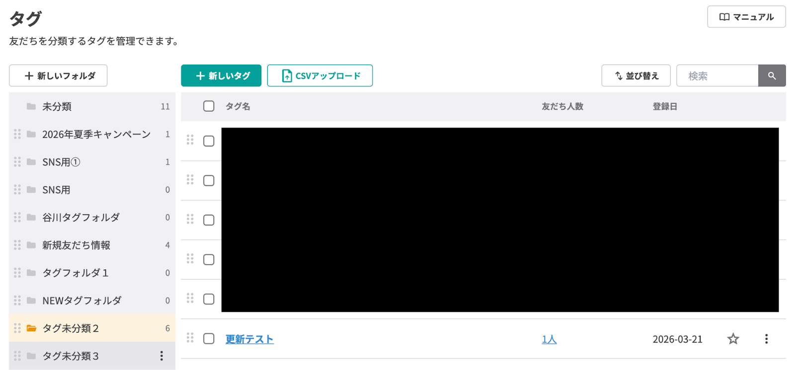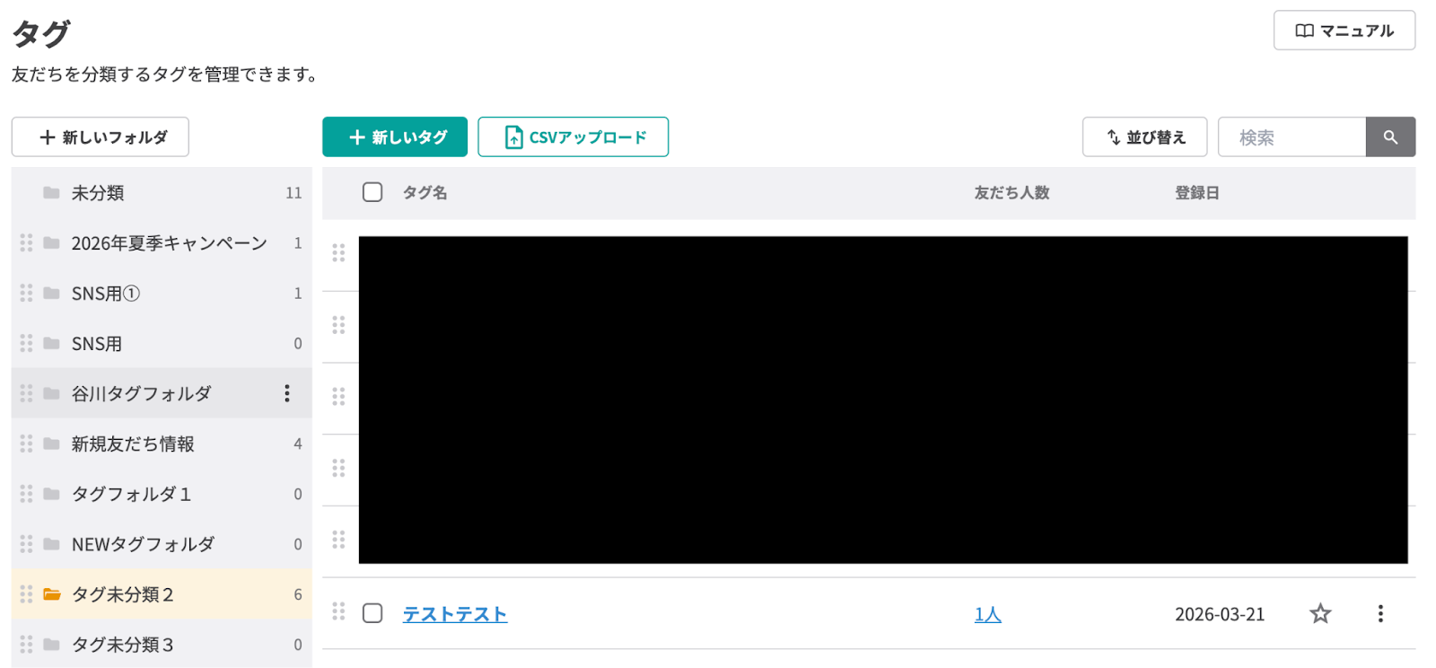 【事前準備】 事前準備としてLinyに更新対象となるタグを作成しておきましょう。 今回はテスト用に、以下の「テストテスト」というタグを作成しました。 このタグを「更新テスト」に変更するフローを解説していきます。