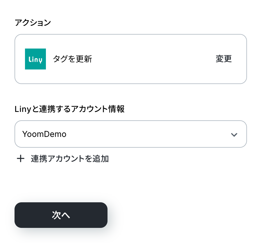 アクションはあらかじめ設定されているため、そのまま内容を確認してください。 Linyと連携するアカウント情報に問題がなければ、「次へ」をクリックします。