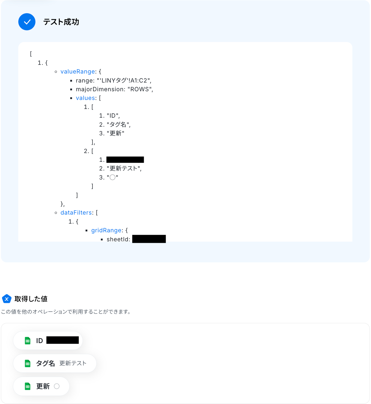 テストに成功すると、Google スプレッドシートに更新された行の情報が表示されます。 以下の画像の取得した値は、後続のステップで利用可能です。 ※取得した値 とは? トリガーやオペレーション設定時に、「テスト」を実行して取得した値のことを指します。 後続のオペレーション設定時の値として利用でき、フローボットを起動するたびに変動した値となります。 内容を確認し、「完了」をクリックします。