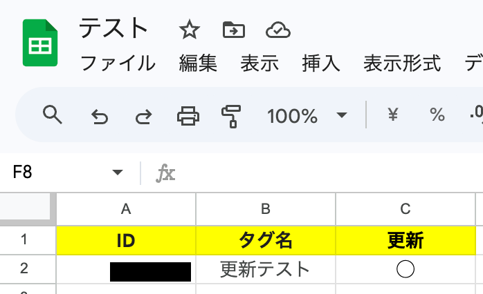 事前準備としてGoogle スプレッドシートで行を更新しておきましょう。 今回はテスト用に、以下の行を更新しました。 更新列に「◯」が入力された行が、更新対象となる想定です。