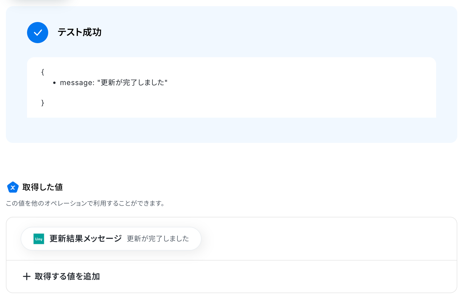 なお、テキストを直接入力した部分は固定値とされるため、取得した値を活用せず設定を行うと毎回同じデータがLinyで更新されてしまうので注意が必要です。