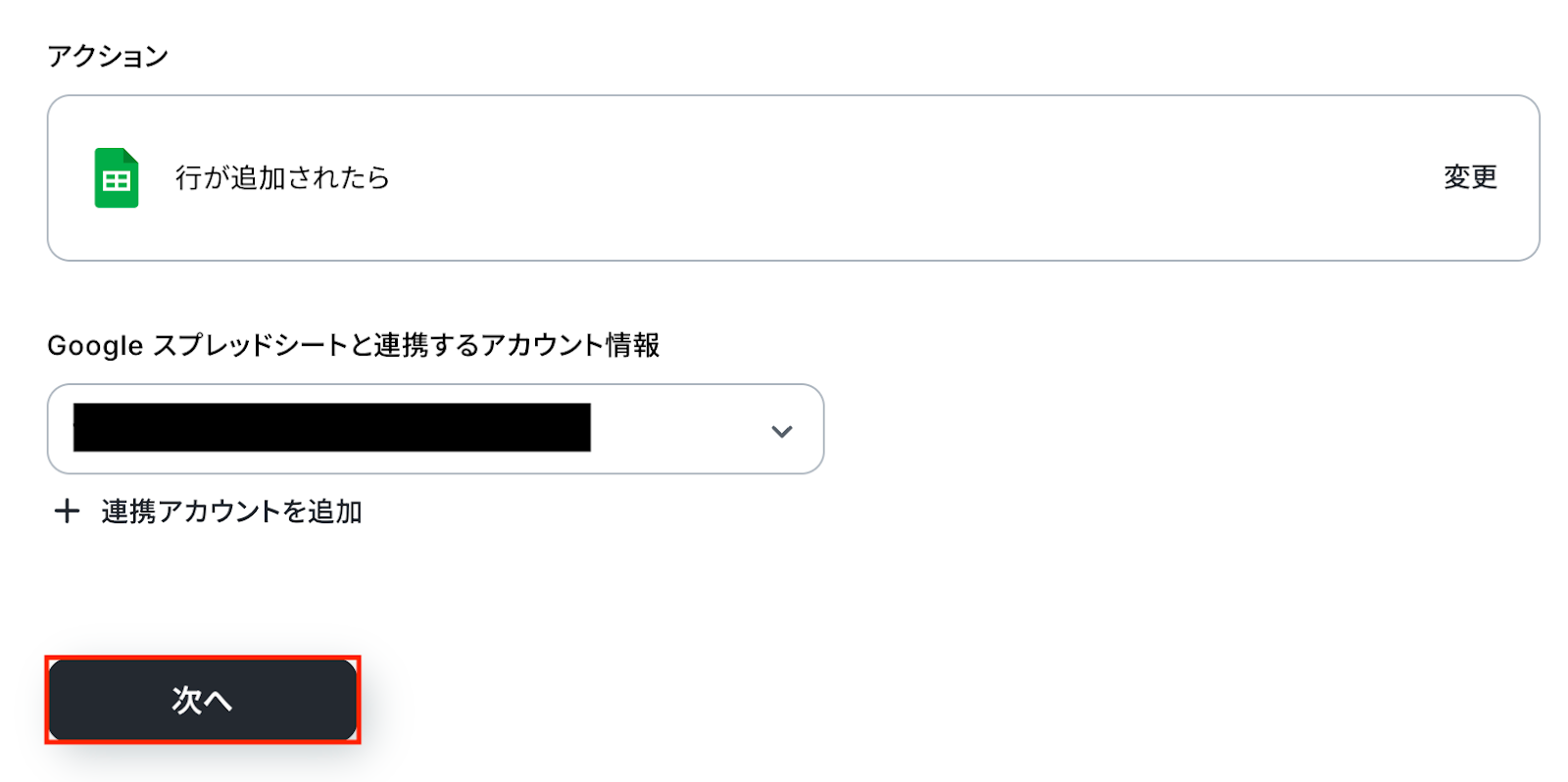 アクションはあらかじめ設定されているため、そのまま内容を確認してください。 Google スプレッドシートと連携するアカウント情報に問題がなければ、「次へ」をクリックします。