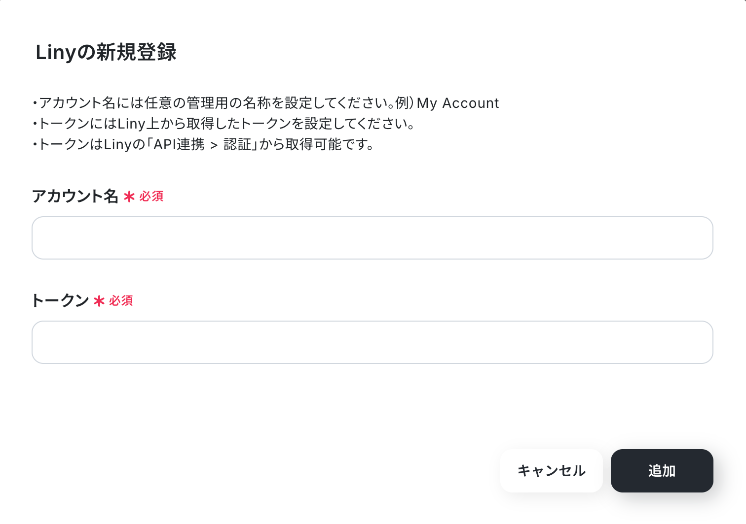 以下の画面が表示されるので、アカウント名とトークンを注釈に沿って入力し、「追加」をクリックしましょう。