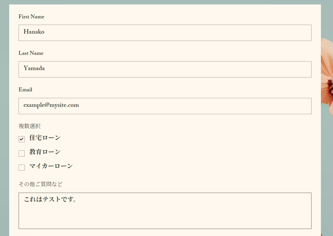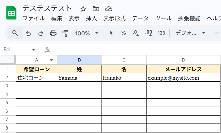 テストに成功すると、Google スプレッドシートにWixのフォーム情報が反映されます! Yoomに戻って「完了」をクリックしましょう。