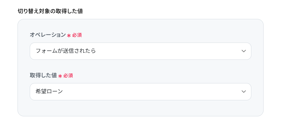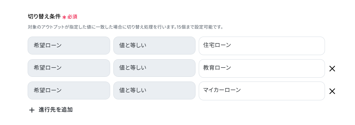 「切り替え条件」を設定します。 グレーの部分は固定値となっています。 画像では「希望ローン」が「住宅ローン」「教育ローン」「マイカーローン」と等しいものを条件に設定しています。 設定が完了したら「完了」をクリックしましょう。