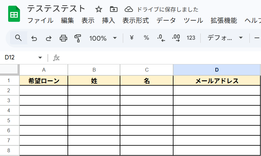 ステップ4:Google スプレッドシートのレコードを追加する Google スプレッドシートと連携してレコードを追加します。 Yoomで設定する前にGoogle スプレッドシートにテスト用のデータを作成しておきましょう! 作成が終わったらYoomに戻ります。
