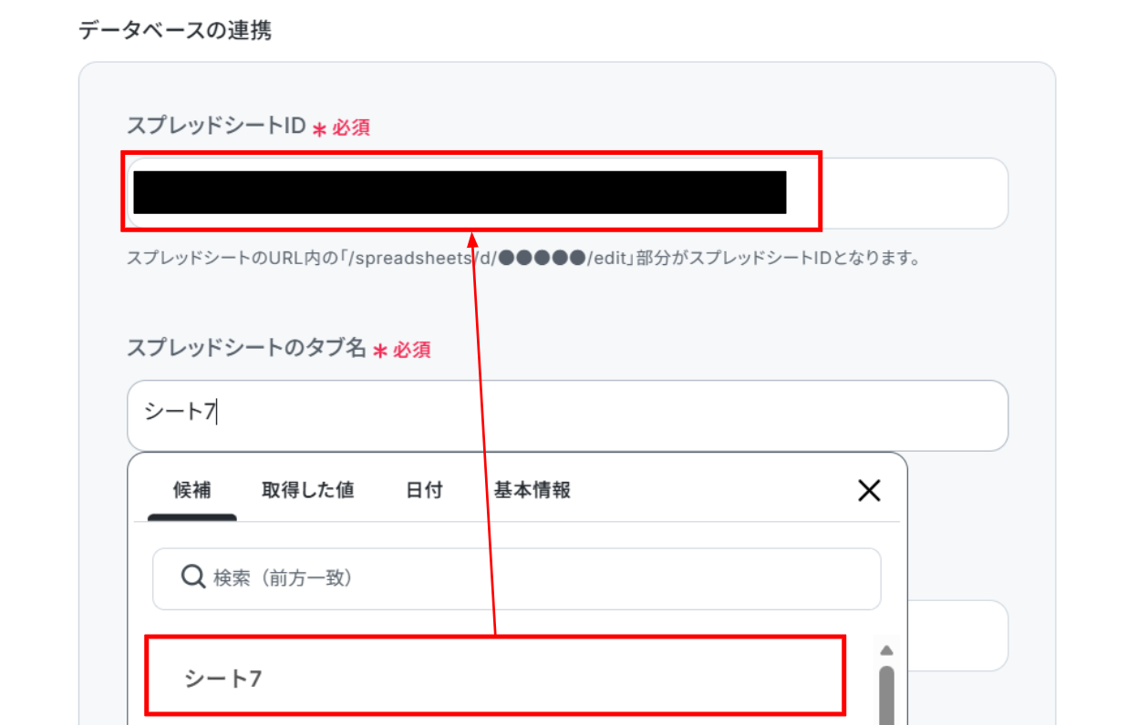 「スプレッドシートID」と「スプレッドシートのタブ名」は候補から選択します。