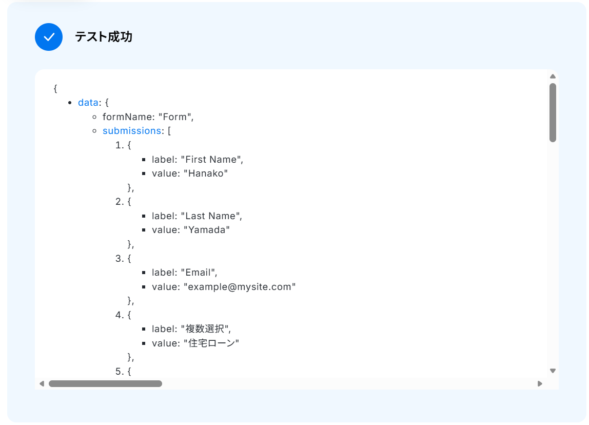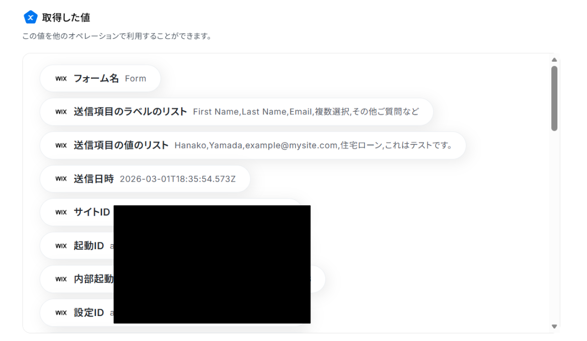テストに成功すると「取得した値」にWixの情報が反映されます。