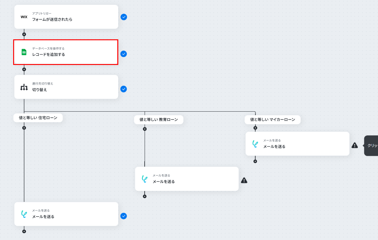 Google スプレッドシートへレコードを追加するオペレーションでは、実際にリード管理を行っている任意のスプレッドシートIDとシート名(タブ名)を設定してください 進行先切り替えのオペレーションでは、Wixフォームのどの項目(例:ローンの種類)を条件に処理を分岐させるか設定してください Yoomでメールを送るオペレーションでは、通知したい担当者のメールアドレスや、メールの件名・本文を任意の内容に設定してください ■注意事項