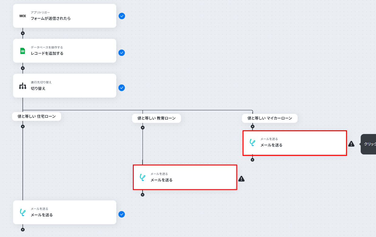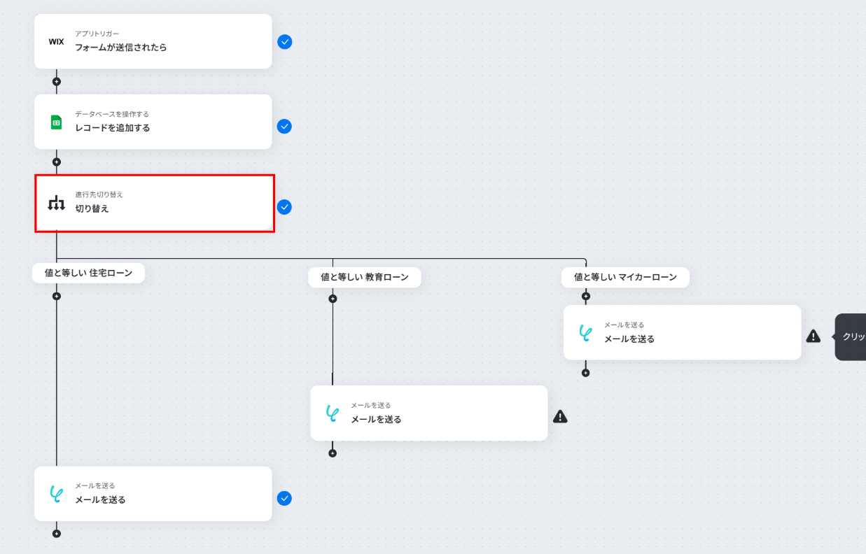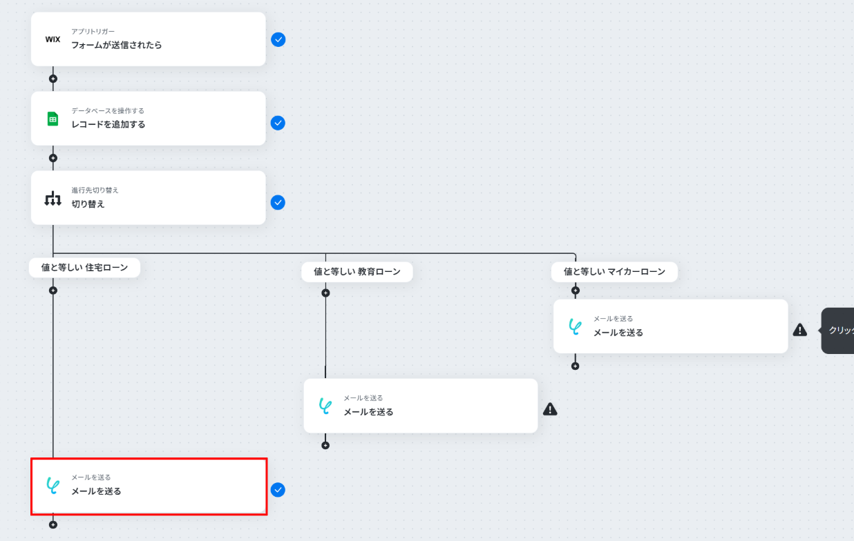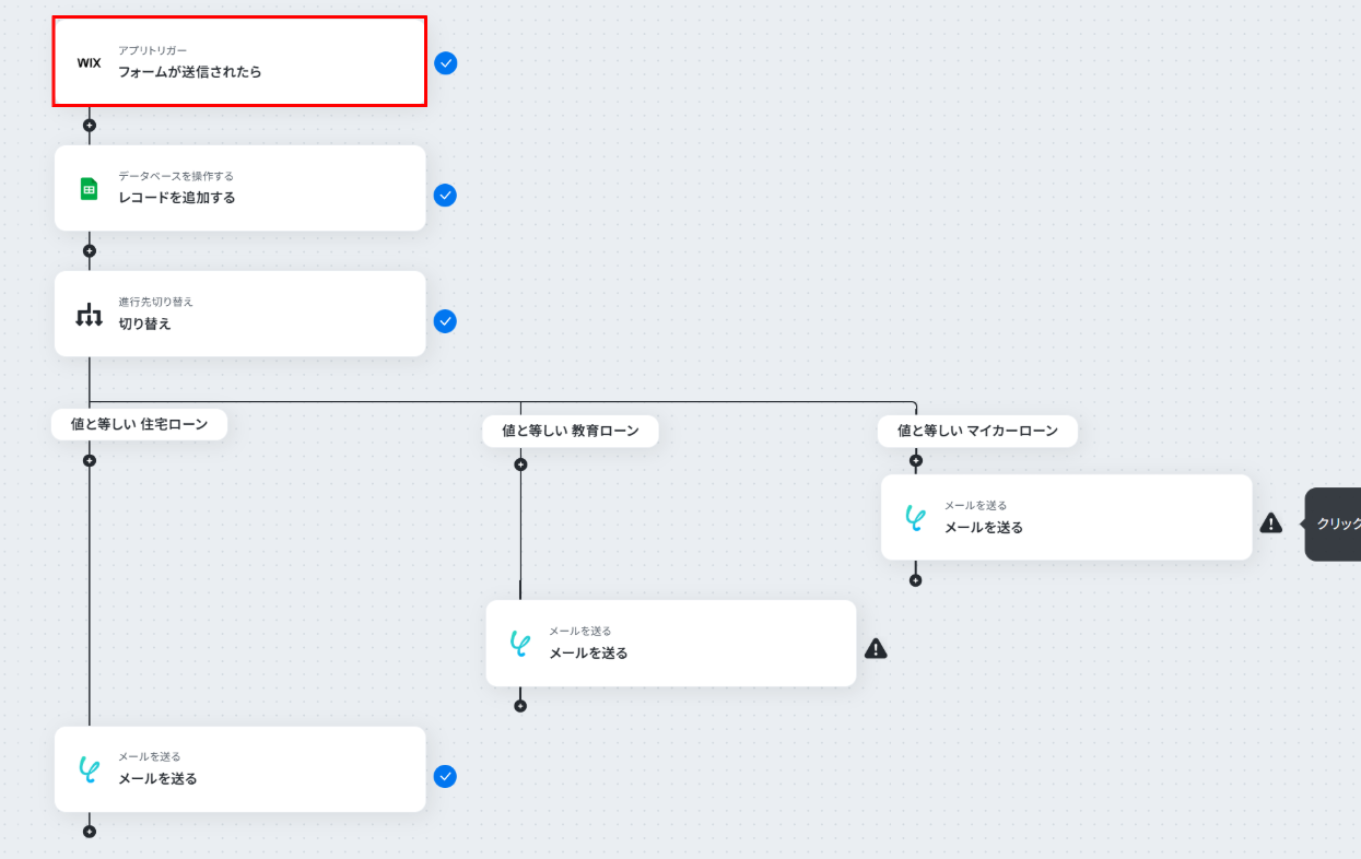 はじめに、WixとGoogle スプレッドシートをYoomと連携します 次に、トリガーでWixを選択し、「フォームが送信されたら」というアクションを設定します 次に、オペレーションでGoogle スプレッドシートの「レコードを追加する」アクションを設定し、フォームの情報を書き込むようにします 続けて、オペレーションで「進行先切り替え」を設定し、フォームで選択されたローンの種類に応じて処理を分岐させます 最後に、各分岐先でYoomの「メールを送る」アクションを設定し、ローンの種類に応じた担当者へ通知メールが自動で送信されるようにします ※「トリガー」:フロー起動のきっかけとなるアクション、「オペレーション」:トリガー起動後、フロー内で処理を行うアクション■このワークフローのカスタムポイント