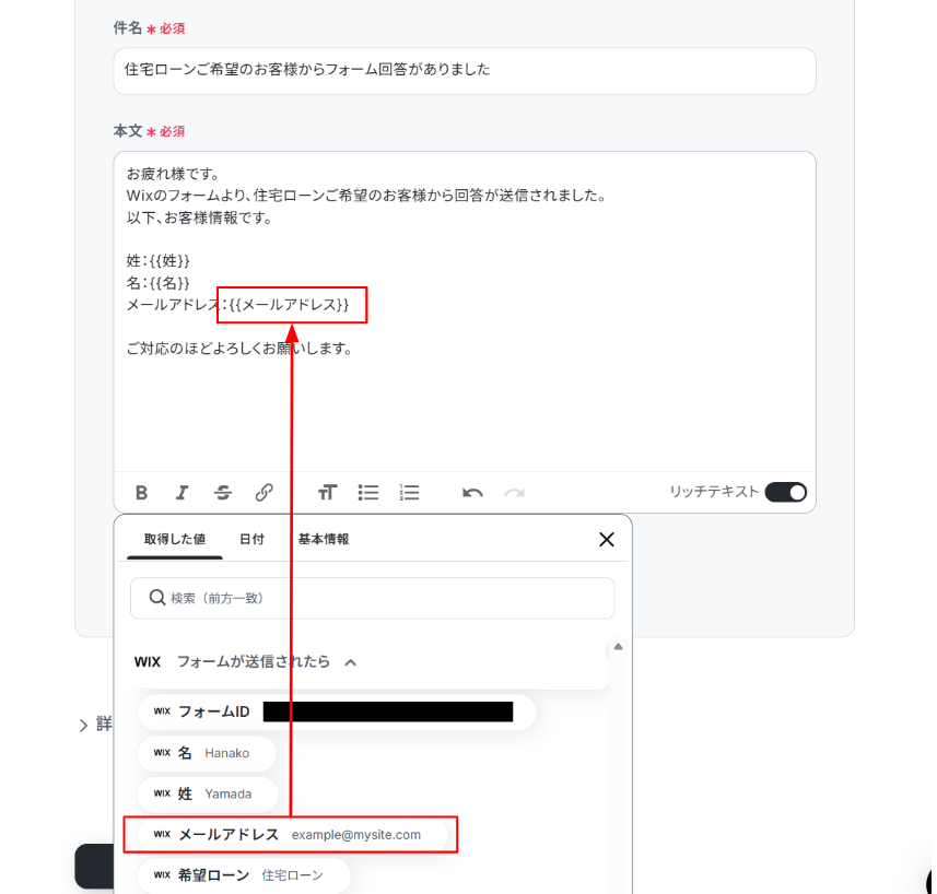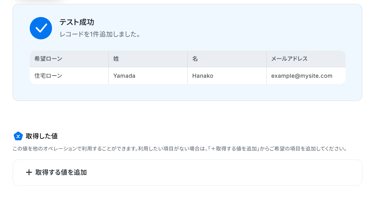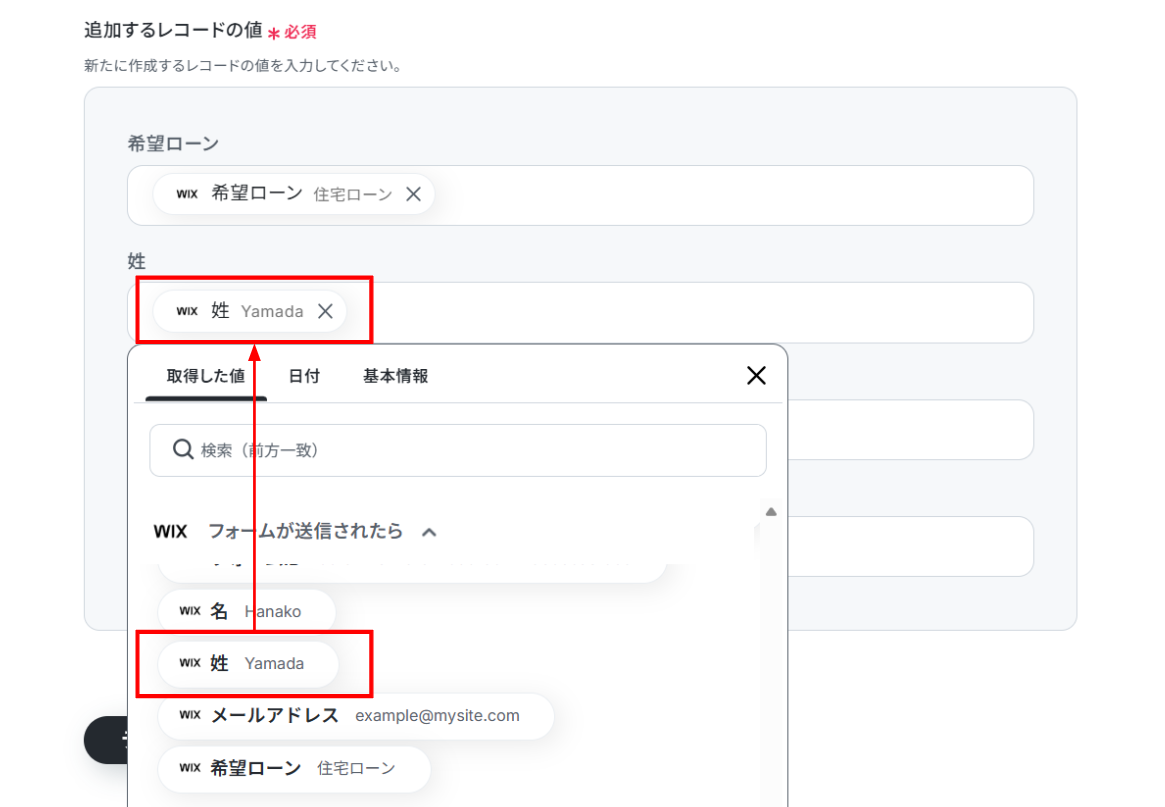 (3)「追加するレコードの値」にWixで取得した値を使って入力します。 「取得した値」を使って入力することで、都度変更することなくWixの最新情報を反映することができます! 入力が終わったら「テスト」をクリックしましょう。
