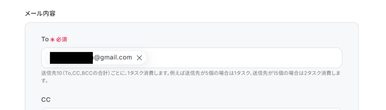 Gmailでメールを送信するアクションでは、通知を送りたい相手のメールアドレス(To, Cc, Bcc)を任意で設定してください。 送信するメールの件名や本文は自由に編集が可能です。前のステップで取得したコピー後のシート名やIDといった情報を本文に差し込むことで、より具体的な内容を通知できます。 ■注意事項