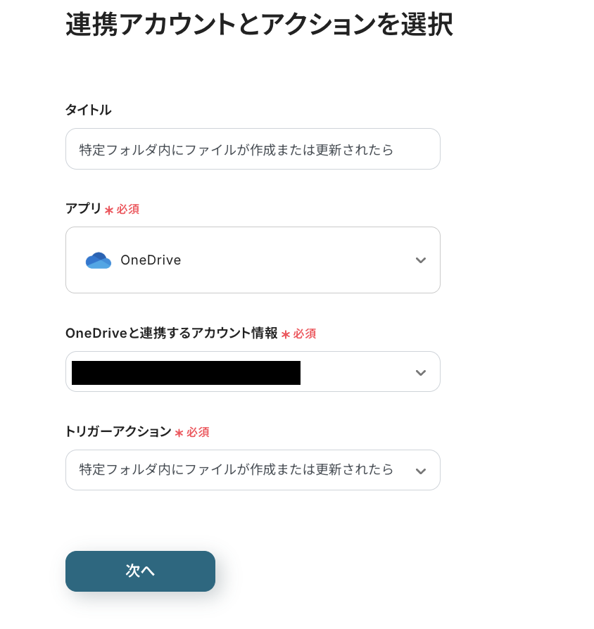 タイトルは必要に応じて編集し、連携するアカウント情報がフローで使用するものであるかどうかを確認しましょう。 基本的に、連携するアカウント情報には、ステップ1で連携した情報が反映されていますよ! トリガーアクションは変更せず、「次へ」をクリックしてください。
