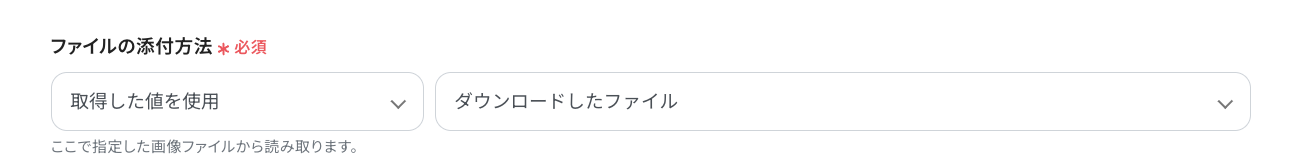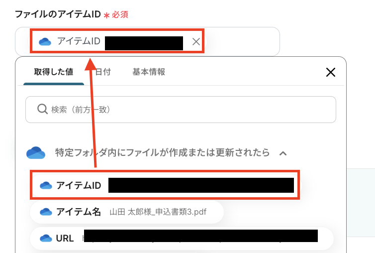 「ファイルのアイテムID」は、入力欄をクリックして表示されるアウトプットを使って設定します。「取得した値」の「特定フォルダ内にファイルが作成または更新されたら」内にある、「アイテムID」を選択しましょう。