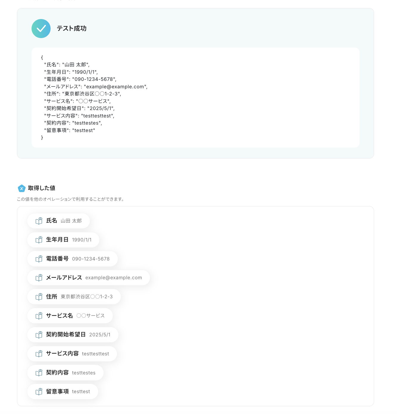 設定が完了したら「テスト」をクリックし、「抽出したい項目」に設定した項目が、正しく抽出されていることを確認してください。