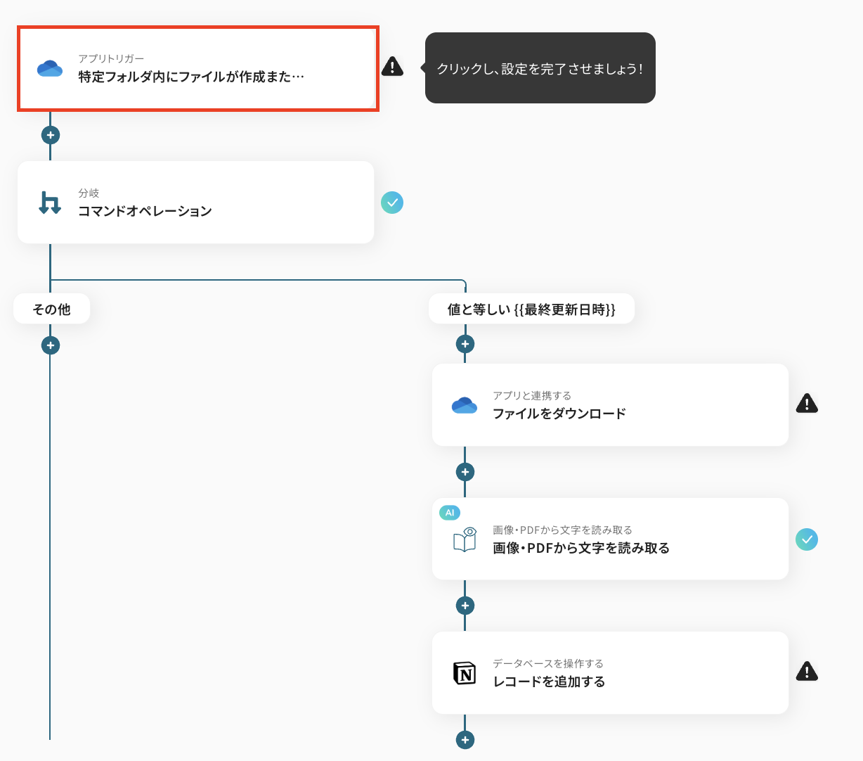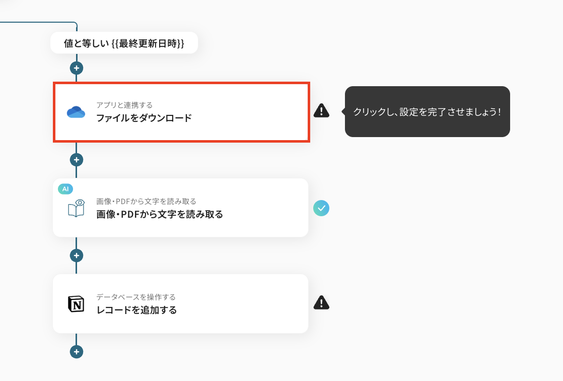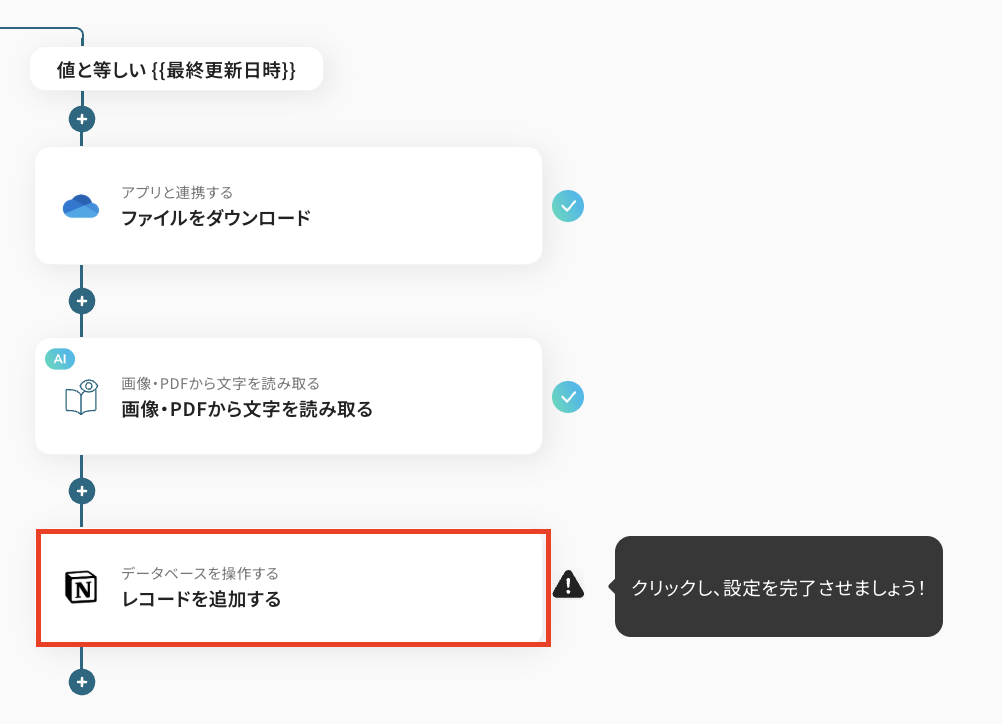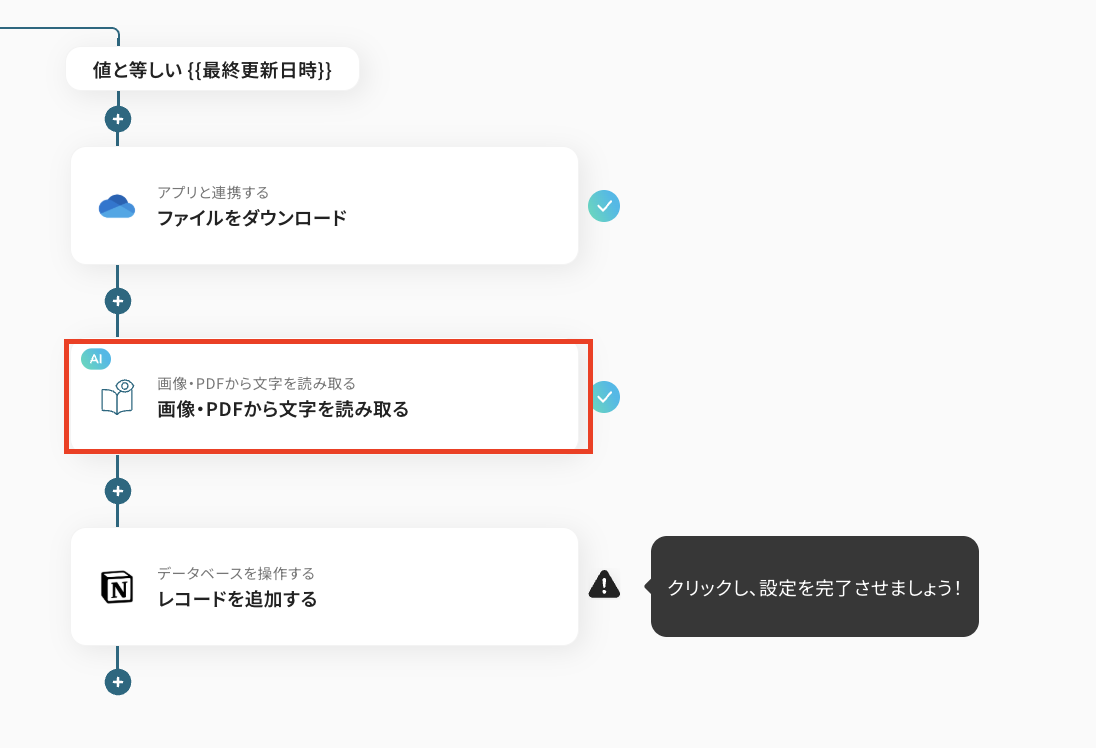それではここから例として、「OneDriveに特定のファイルがアップロードされた際に、そのファイルからOCR機能で文字情報を抽出し、Notionデータベースに自動で追加する 」フローの作成手順を解説していきます!