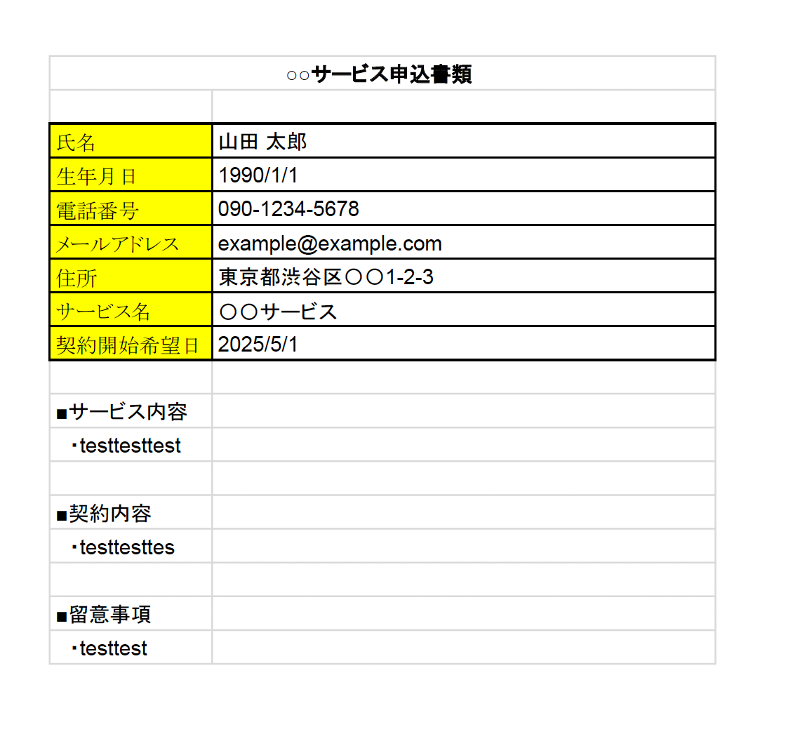 今回は下図のような書類をテスト用にアップロードしました。 テスト用なので、架空の情報(「テスト太郎」や「テスト株式会社」など)でOKですよ!