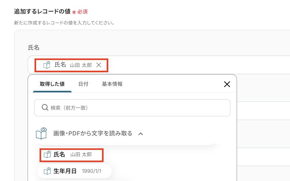 次に、データベース操作の詳細設定をしていきます。 「追加するレコードの値」に、それぞれ入力欄をクリックして表示されるアウトプットから、適切な値を選択して設定してください。 たとえば、「氏名」には、「画像・PDFから文字を読み取る」内にある「氏名」を選択しましょう。