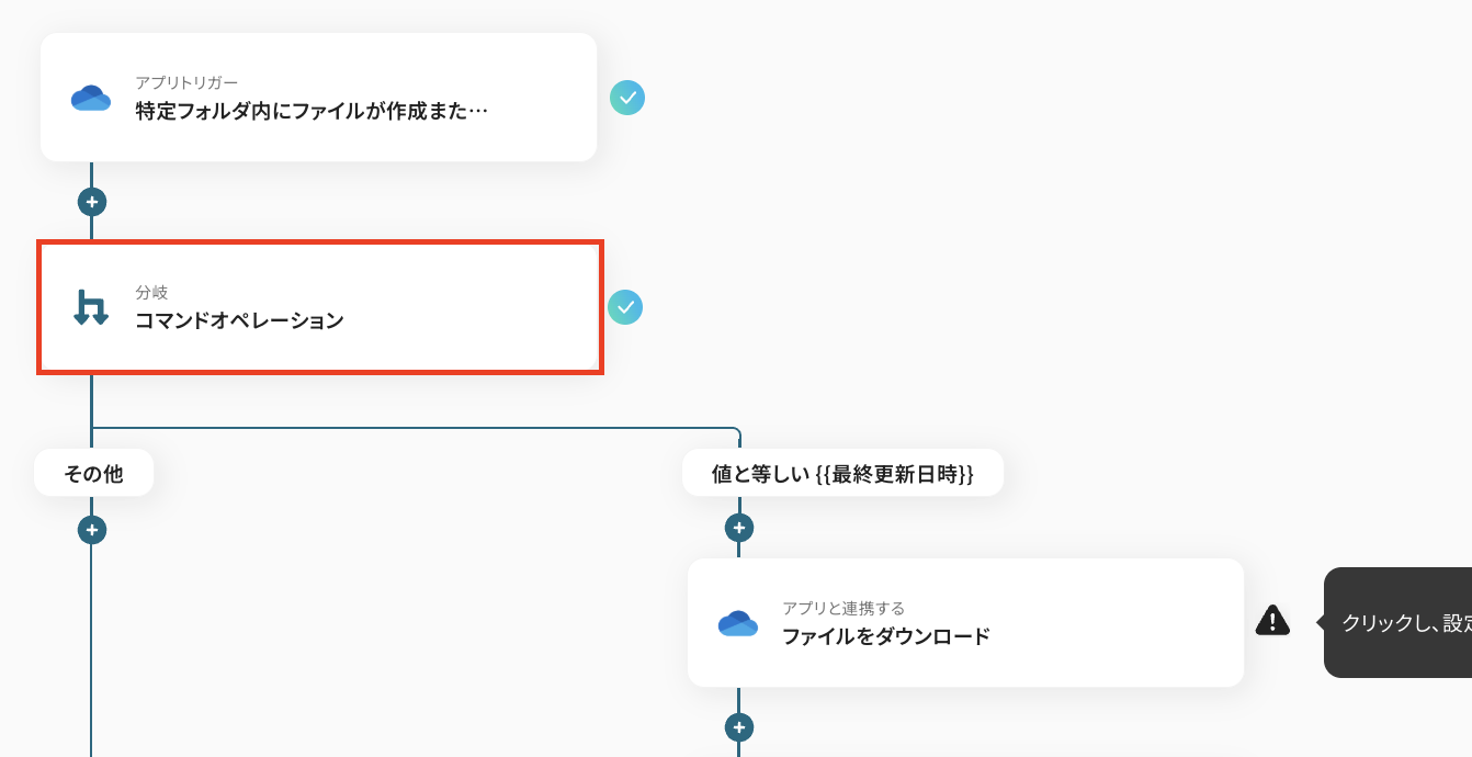 続いて、分岐条件の設定を行います。 ここでは、作成日時が最終更新日時と等しい場合に、後続のファイルダウンロードの設定に進むように設定していきますよ! 「コマンドオペレーション」をクリックしてください。