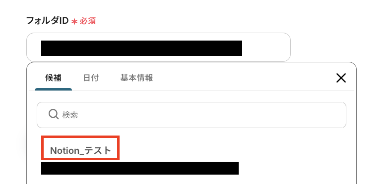 「フォルダID 」も同様に候補から選択してくださいね!ここで設定したフォルダ内にファイルが作成・更新されると、フローボットが起動するようになります。
