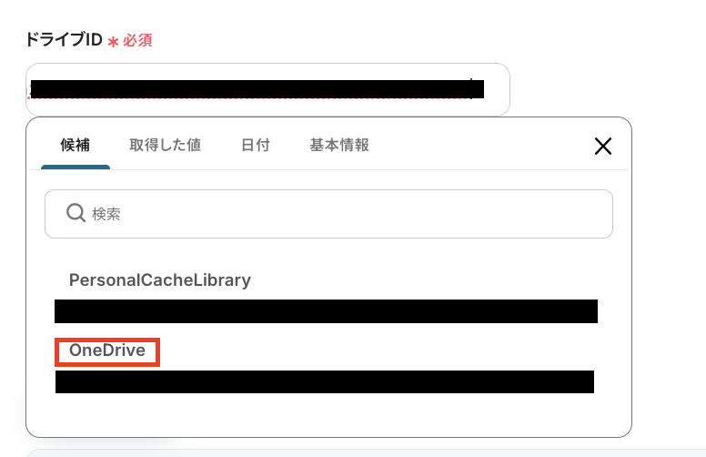 「ドライブID 」は、入力欄をクリックして表示される候補から選択しましょう。候補は、連携しているアカウントに紐づいて表示されていますよ!