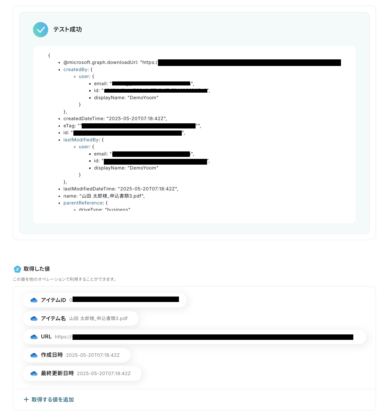 アップロードしたら、Yoomの画面に戻って「テスト」をクリックしてください。 テストが成功すると、「取得した値に」テスト用にアップロードしたファイル情報が、アウトプットとして抽出されるので、内容を確認しましょう。