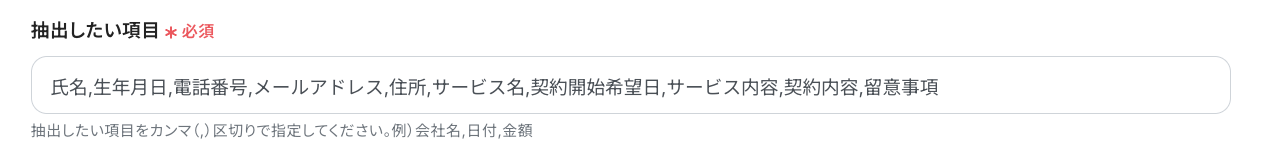 ・抽出したい項目 :ファイルから抽出したいテキストデータの項目を設定します。「会社名」や「メールアドレス」など、抽出したい項目をカンマ(,)区切りで入力してくださいね!