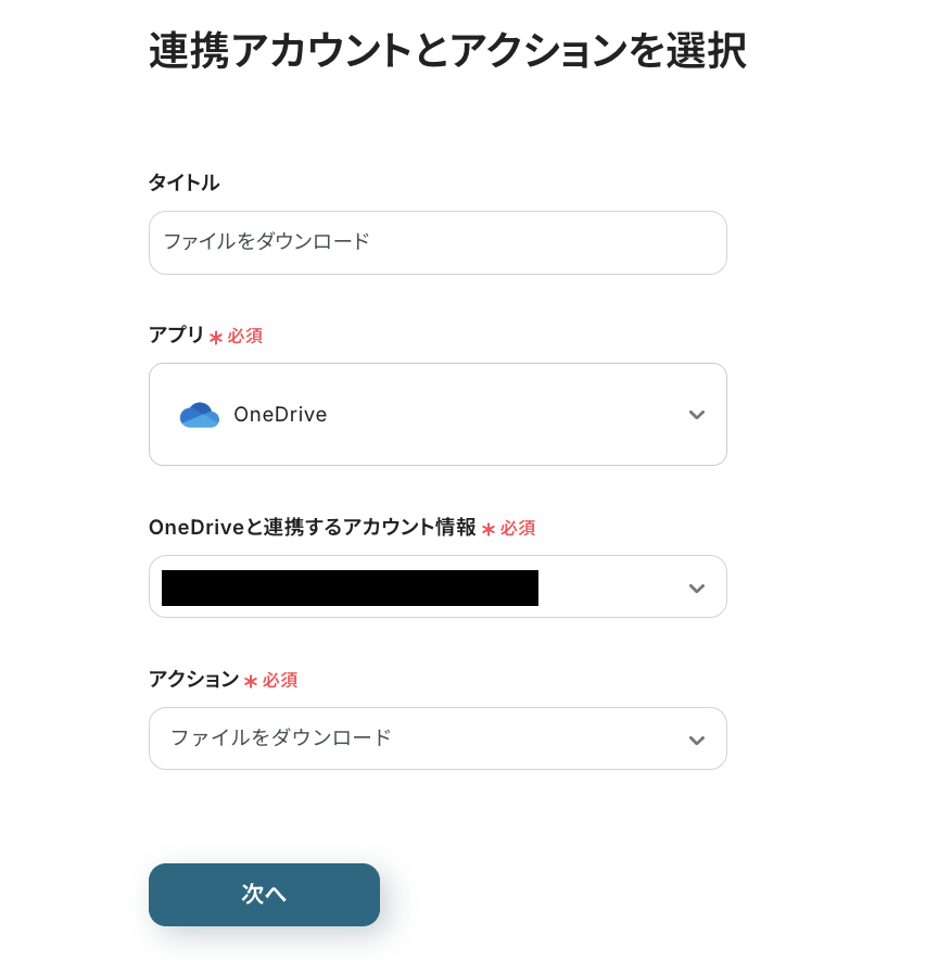 タイトルを必要に応じて編集し、連携するアカウント情報はステップ3と同じアカウントであることを確認しましょう。アクションは変更せず、「次へ」をクリックしてください。