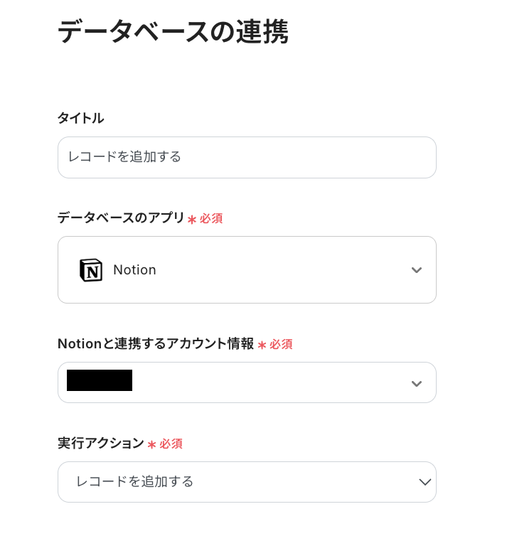 これまでと同じようにタイトルは必要に応じて編集し、連携するアカウント情報がフローで使用するもので間違いないかを確認しましょう。実行アクションは「レコードを追加する」のままにして、ページ下の「データベース連携」の設定に進んでください。