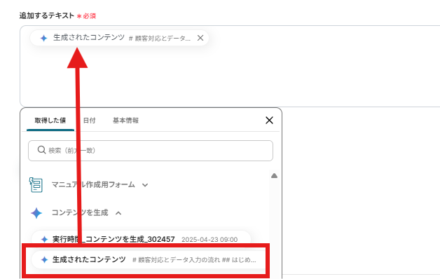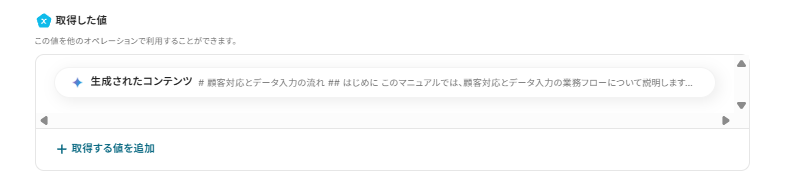 テスト成功後、取得した値の箇所に生成された内容が表示されます。
