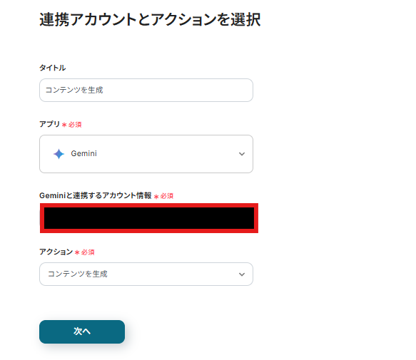 タイトルと連携するアカウント情報を任意で設定し、アクションはテンプレート通りのまま「次へ」をクリックして進んでください。