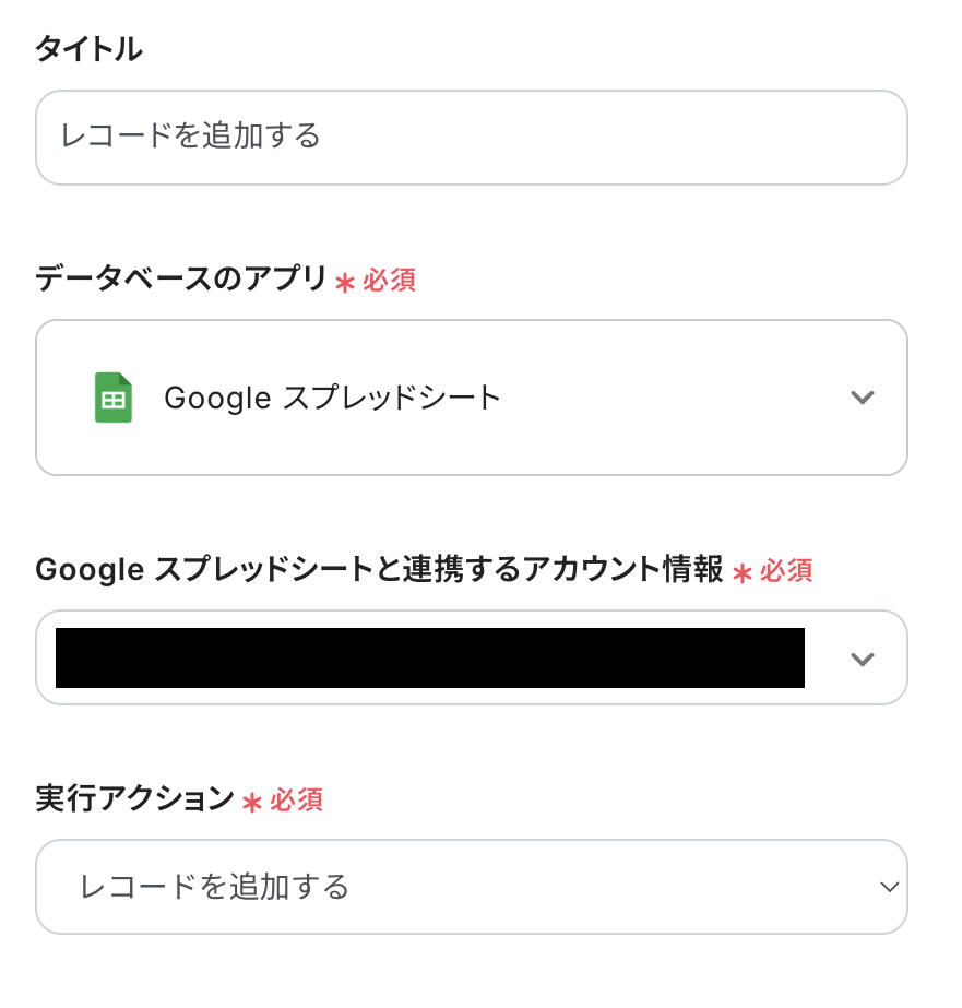 必要箇所を入力していきます。 「タイトル」:必要に応じて変更可能 「 Google スプレッドシートと連携するアカウント情報」:合っているか確認 「実行アクション」:「レコードを追加する」を選択