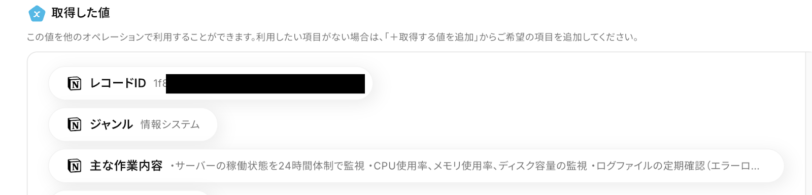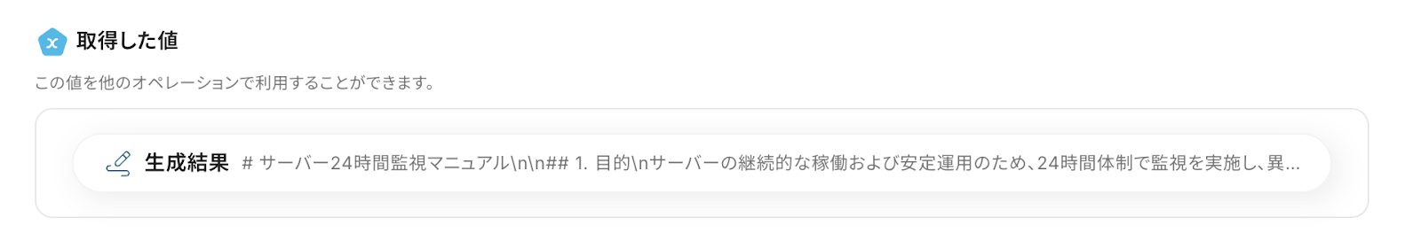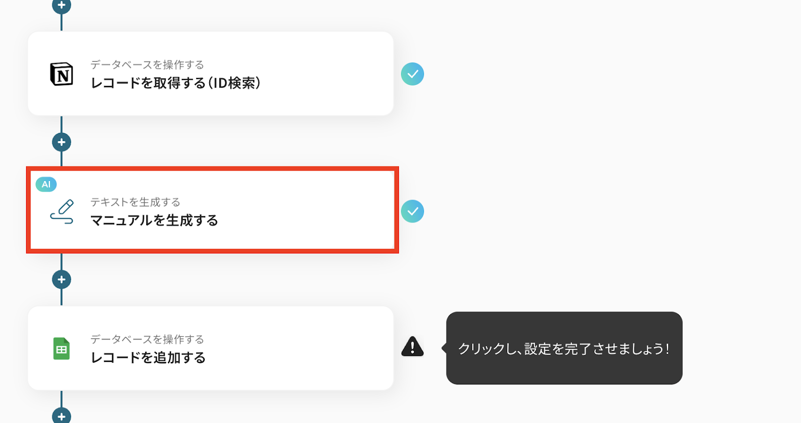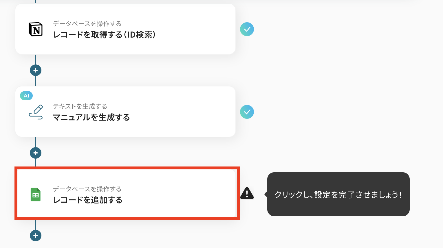 以上が、Notionに業務データが追加されたら、AIでマニュアル案を作成してGoogle スプレッドシートに追加するための連携手順になります。