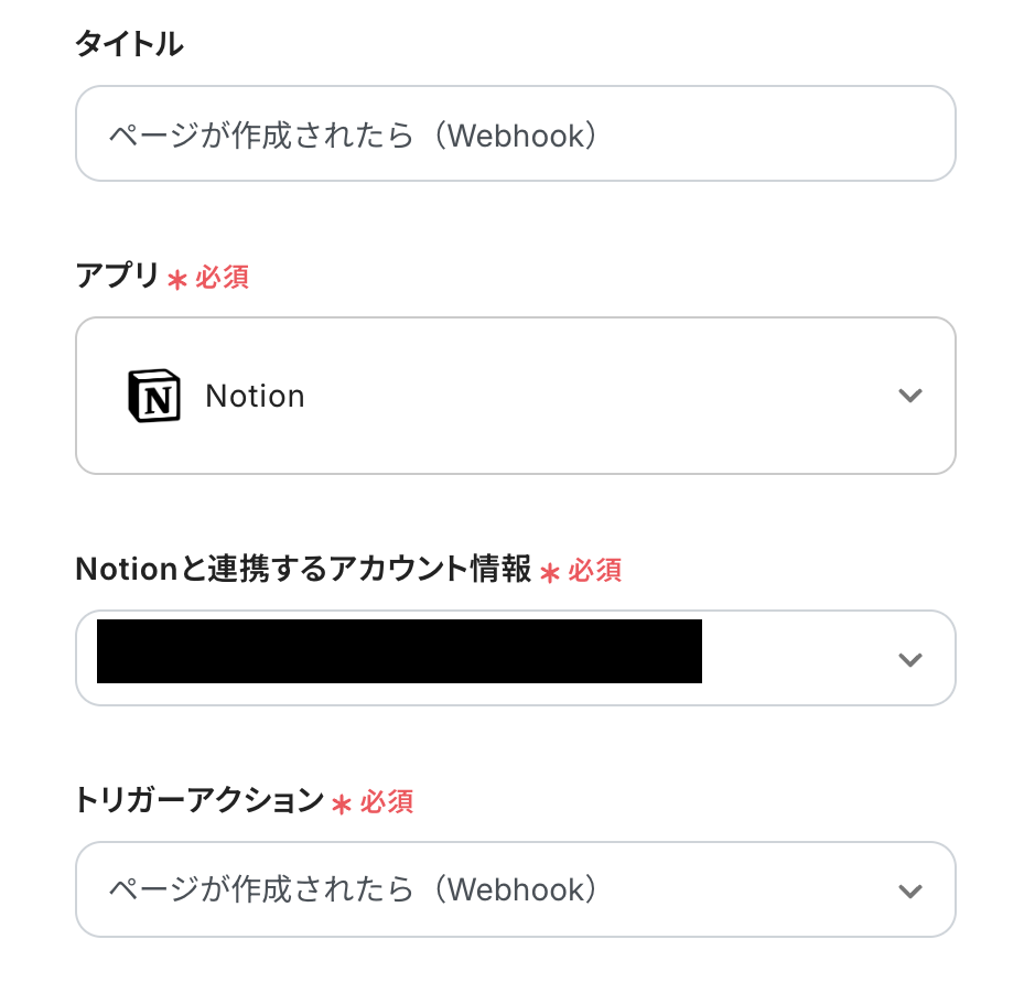 必要箇所を入力していきます。 「タイトル」:必要に応じて変更可能 「Notionと連携するアカウント情報」:合っているか確認 「トリガーアクション」:「ページが作成されたら(Webhook)」を選択