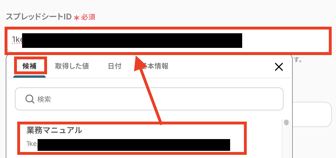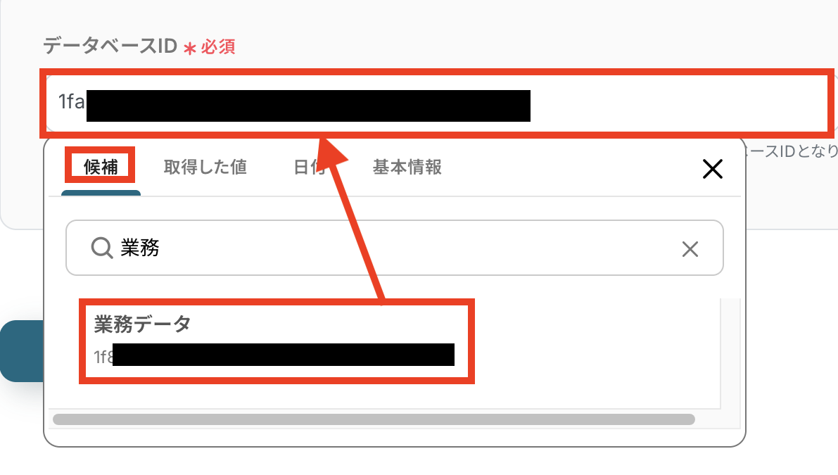 「データベースID」は候補から選ぶことができます。 入力欄をクリックして候補一覧を表示させましょう。 (検索窓を活用すると、探す手間も省けます。)